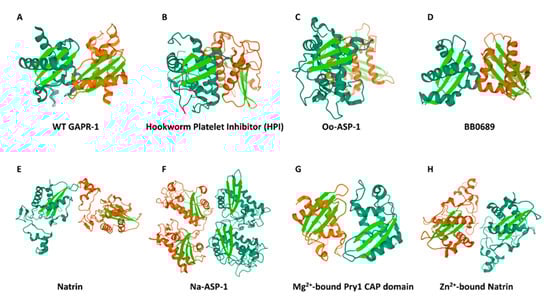 - Asojo, O.A. Structure of a two-CAP-domain protein from the human hookworm parasite Necator americanus. Acta Crystallogr. Sect. D Biol. Crystallogr. 2011, 67, 455–462. [Google Scholar] [CrossRef]