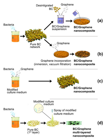 In order to overcome the difficulties of incorporating graphene into the BC network, a novel layer-by-layer self-assembly route (Figure 1d) has been proposed [47,48,49,50]. First, a conventional growing medium is used to grow a first BC pellicle. A modified growing medium is prepared adding a graphene suspension. Then, this modified medium is sprayed onto the first BC pellicle forming a thin layer of culture medium on which new BC nanofibres are synthetized in presence of graphene platelets. This process is repeated several times until the desired thickness is achieved. This layer-by-layer method results in the formation of mechanically strong and thick three dimensional BC-GO network [50].