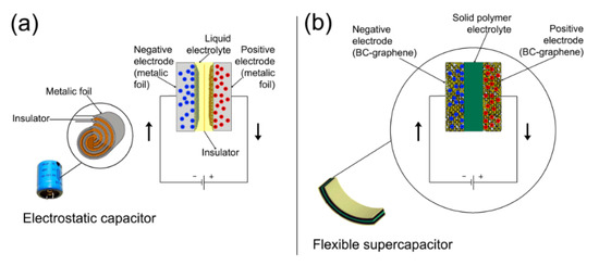 The electrodes of conventional EDLCs are formed by a layer of activated carbon paste deposited onto a metallic current collector. A metallic casting encases the electrodes immersed in a liquid electrolyte (Figure 2a). However, the large micro/macropores within activated carbon is disadvantageous for the adsorption of the electrolyte on the surface of electrodes, deteriorating the function of EDLCs. In addition, for some emerging applications such as wearable electronics, electronic newspapers and paper-like mobile phones [75], conventional EDLCs are heavy and are incompatible with large strains.