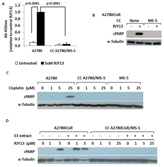 Initially, we used an ELISA kit to monitor the ability of our synthesized platinum prodrug RJY13 [44] to induce apoptosis by monitoring cleavage of nuclear PARP in OC cells exposed to RJY13, as a marker of cells undergoing apoptosis [45]. Upon exposure to RJY13, significant induction of cleaved PARP was observed in OC cells, whereas only marginal PARP cleavage was observed in OC cells co-cultured with MS-5 cells and exposed to RJY13 (Figure 1A). Next, we monitored PARP cleavage by immunoblotting in a co-culture experiment using a species-selective PARP antibody that recognizes the cleaved forms of PARP from human origin, but not from murine origin (Figure 1B). Exposure of OC cells to cisplatin (Figure 1C) or RJY13 (Figure 1B,D) resulted in significant induction of apoptosis in A2780 cells (Figure 1C), as well as in A2780CisR cells (Figure 1B,D); however, they failed to induce apoptosis in A2780 or A2780CisR cells co-cultured with MS-5 cells (Figure 1). Moreover, the presence of Oriental mistletoe extract, which enhances RJY13 activity against cisplatin-resistant OC cells (A2780CisR) [46], failed to induce apoptosis of the same cells when they were co-cultured with MS-5 cells (Figure 1D).