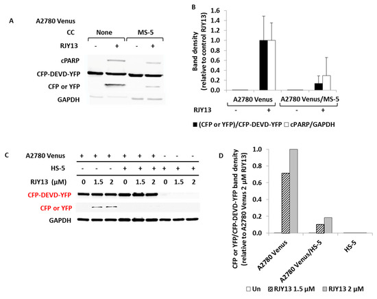HS-5 cells confer drug resistance to OC cells. OC cisplatin sensitive cells carrying pECFP-DEVDR-Venus plasmid (A2780 Venus) cells were co-cultured with MS-5 (A,B) or HS-5 (C,D) and exposed to 5 μM RJY13 or 1.5 or 2 μM RJY13, respectively. Levels of cleaved CFP/YFP (CFP or YFP, A,C) and cleaved human PARP (cPARP, A) were determined by immunoblotting (A,C). Relative cPARP levels as well relative levels of cleaved CFP were calculated and plotted (B,D). GAPDH was used as a loading control. CC, co-culture.