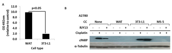 We explored the possibility of adipocyte cells affecting platinum drug sensitivity of OC cells, utilizing 3T3-L1 cells that were stimulated to differentiate to white adipocytes (WAT) based on a well-established protocol [48]. Differentiated and undifferentiated adipocyte cells were co-cultured with OC cells and exposed to RJY13, and PARP cleavage was monitored. Figure 3 shows that differentiated 3T3-L1 cells (WAT) stimulated the accumulation of fat droplets, as measured by Oil red assay (Figure 3A). We then monitored PARP cleavage by immunoblot (Figure 3B), and found that platinum treatment (RJY13 or cisplatin) stimulated PARP cleavage, and that the presence of MS-5 cells conferred drug resistance, as previously demonstrated (Figure 1). Interestingly, no PARP cleavage was observed in samples of OC cells co-cultured with differentiated 3T3-L1 cells. In contrast, co-culture of undifferentiated (progenitor) 3T3-L1 cells with OC cells showed minor effects on the amount of cleaved PARP after exposure to RJY13. This argues that differentiated 3T3-L1 cells confer drug resistance to platinum compounds, whereas undifferentiated, progenitor 3T3-L1 cells do not.