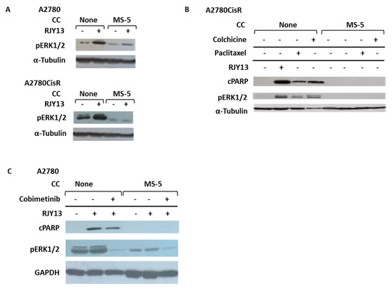 Figure 4A shows that treatment of OC cells with RJY13 resulted in upregulation of phospho-ERK1/2 in both OC cell lines (A2780 and A2780CisR). Interestingly, co-culture of OC cells with MS-5 cells resulted in blocked ERK1/2 activation (Figure 4A) following exposure to platinum compound, arguing that MS-5 co-culture interferes with platinum-mediated ERK1/2 activation. Similarly, exposure of OC cells to paclitaxel or colchicine resulted in induction of apoptosis in OC cells, as measured by PARP cleavage (Figure 4B), whereas co-culture of OC cells with MS-5 cells prevented PARP cleavage and abolished the sensitivity of OC cells to the different drugs. Exposure of OC cells to paclitaxel or colchicine also resulted in upregulation of phospho-ERK1/2, correspondingly, co-culture of OC cells with MS-5 cells resulted in blockage of ERK1/2 phosphorylation (Figure 4B). To further support the involvement of ERK in platinum-induced apoptosis, we used cobimetinib, an orally bioavailable small-molecule inhibitor of mitogen-activated protein kinase kinase 1 (MEK1) which also inhibits ERK phosphorylation [49], and monitored its ability to affect platinum-induced apoptosis of OC cells. Figure 4C shows that cobimetinib significantly inhibited ERK1/2 phosphorylation in A2780 cells and in parallel, moderately affected the ability of platinum to induce apoptosis, as evidenced by a moderate reduction in the levels of cleaved PARP. This argues that ERK1/2 activation mediates, in part, the apoptosis-inducing function of platinum compounds in A2780 cells.