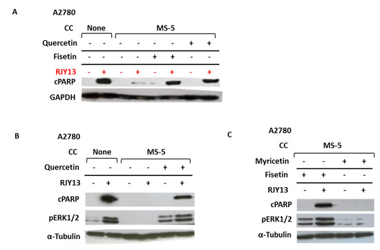 To explore the role of ERK1/2 in MS-5-mediated drug resistance, we asked whether downregulation of phospho-ERK1/2 as a result of co-culture with MS-5 cells is responsible for mediating platinum drug resistance in OC cells. We tested the hypothesis that fisetin and related flavonoids might be useful for restoring platinum sensitivity of OC cells by activating the ERK1/2 pathway. Figure 5A shows that the presence of MS-5 cells prevented apoptosis induction of OC cells exposed to RJY13, as monitored by the presence of cleaved PARP. However, sensitivity of OC cells to RJY13 was restored when 10 μM of either quercetin or fisetin was added with RJY13, as evidenced by the presence of cleaved PARP protein in OC cells treated with RJY13 in co-culture with MS-5 cells (Figure 5A). Moreover, fisetin and quercetin were both active in stimulating ERK1/2 phosphorylation in the co-culture, in both the presence and absence of RJY13 (Figure 5B,C). Interestingly, the flavonoid myricetin, which exhibited no activity in restoring drug sensitivity to OC cells, also failed to significantly activate ERK1/2 (Figure 5C).