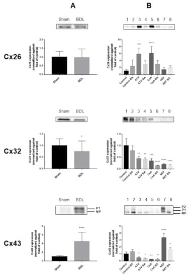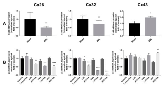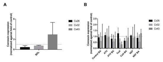 In conclusion, our results show that cholestasis affects connexin expression both in vivo and in vitro. While the changes in the expression patterns of Cx26 and Cx43 varied among experimental settings (i.e., in vivo or in vitro) or, for the in vitro model, among cholestatic drugs (i.e., ATV, CsA or NEF), a more generalized response was seen for Cx32. Cx32 production was downregulated at both levels (i.e., transcriptional and translational) in liver samples of mice subjected to BDL as well as in samples from human hepatoma HepaRG cell cultures exposed to cholestatic drugs (i.e., ATV, CsA and NEF) in the presence of BAs. This has also been observed in many other liver pathologies [] and could suggest a role for Cx32 as a robust biomarker of liver disease and toxicity.
