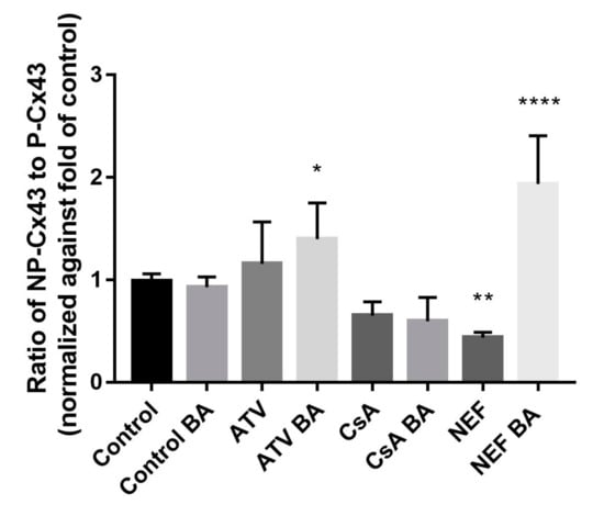 Ratio of protein expression of non-phosphorylated Cx43 to phosphorylated Cx43. Human hepatoma HepaRG cells were exposed to cholestatic drugs either in the absence or presence of a 50× concentrated mixture of bile acids (BA) for 72 h and compared to untreated cells, indicated in the figure as control. Following immunoblot analysis of total Cx43, a second analysis of the expression level of the phosphorylated (P1/P2) and non-phosphorylated (NP) isoforms was performed. The ratio of NP-Cx43 to P1/P2-Cx43 in all different experimental conditions (i.e., 1 = control; 2 = control BA; 3 = atazanavir (ATV); 4 = ATV BA; 5 = cyclosporine A (CsA); 6 = CsA BA; 7 = nefazodone (NEF); 8 = NEF BA) was normalized against total protein loading and expressed as relative alterations compared to control samples. Data were processed by a parametric one-way ANOVA followed by post hoc tests with Dunnett’s correction. Data are expressed as means +/− SD with * p ≤ 0.05 ** p ≤ 0.01 and **** p ≤ 0.0001 compared to control samples (control n = 3; control BA n = 3; ATV n = 3; ATV BA n = 3; CsA n = 3; CsA BA n = 3; NEF n = 3; NEF BA n = 3) (N = 1).