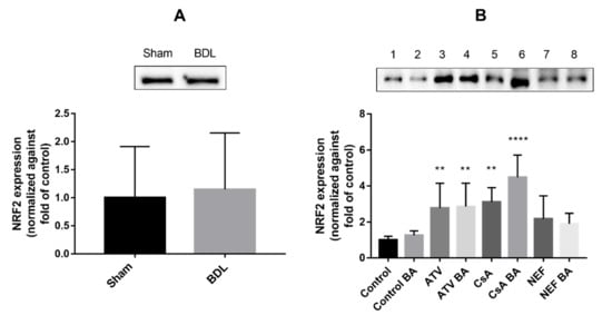 Nrf2 protein expression in cholestasis. Semi-quantitative immunoblot analysis of Nrf2 protein in livers of cholestatic mice (A) and in human hepatoma HepaRG cells cultured in cholestatic conditions (B) was performed. Signals of Nrf2 were normalized against total protein loading and expressed as relative alterations compared to sham-operated animals or to control samples, respectively. (A) Liver sections were obtained from male mice following bile duct ligation (BDL) for 20 days. Data were processed by a parametric student t-test with Welch’s correction. Data are expressed as means +/− SD compared to sham-operated animals (Sham n = 12; BDL n = 18) (N = 1). (B) Human hepatoma HepaRG cells were exposed to cholestatic drugs either in the absence or presence of a 50× concentrated mixture of bile acids (BA) for 72 h and compared to untreated human hepatoma HepaRG cells, indicated in the figure as control. The different experimental conditions are presented in the figure as: 1 = control; 2 = control BA; 3 = atazanavir (ATV); 4 = ATV BA; 5 = cyclosporine A (CsA); 6 = CsA BA; 7 = nefazodone (NEF); 8 = NEF BA. Data were processed by a parametric one-way ANOVA followed by post hoc tests with Dunnett’s correction. Data are expressed as means +/− SD with ** p ≤ 0.01 and **** p ≤ 0.0001 compared to control samples (control n = 3; control BA n = 3; ATV n = 3; ATV BA n = 3; CsA n = 3; CsA BA n = 3; NEF n = 3; NEF BA n = 3) (N = 1).