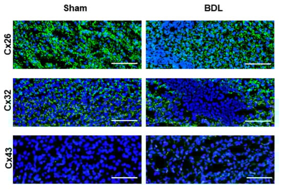 Gap junctions provide a pathway for the direct exchange of small and hydrophilic molecules and ions between adjacent cells [,]. By doing so, they act as goal keepers of the cellular life cycle. In the liver, intercellular communication mediated by gap junctions underlies critical functions, including xenobiotic biotransformation [,,], secretion of albumin [], glycogenolysis [], ammonia detoxification [] and bile secretion []. Gap junctions arise from the interaction of two hemichannels of neighboring cells, which in turn are built up by six connexin (Cx) proteins. More than 20 different connexin proteins have been identified in humans and rodents, and all are expressed in a cell type-specific way [,]. In the liver, hepatocytes mainly produce Cx32 and small quantities of Cx26, while non-parenchymal liver cells typically harbor Cx43 [,,]. However, connexin expression patterns drastically alter upon liver disease. Our group previously showed that Cx43 production is induced, while Cx32 and Cx26 expression is decreased, in acetaminophen-induced acute liver failure in mice []. Likewise, reduced Cx32 and elevated Cx43 levels have been observed in experimental rodent models of liver fibrosis and cirrhosis as well as in human cirrhotic liver [,,,,]. However, the expression of these three connexin proteins in cholestasis has been poorly documented thus far. Therefore, the objective of the present study was to investigate whether changes in liver connexin expression, as seen in other liver injuries, can also be detected in cholestatic liver disease.