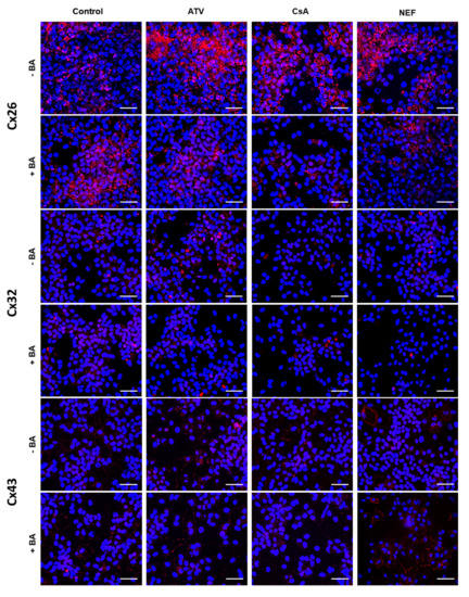 Connexin protein localization in human hepatoma HepaRG cells cultured in cholestatic conditions. Human hepatoma HepaRG cells were exposed to cholestatic drugs either in the absence or presence of a 50× concentrated mixture of bile acids (BA) for 72 h and compared to untreated human hepatoma HepaRG cells, indicated in the figure as control. Cellular localization of the three connexin species, namely Cx26, Cx32 and Cx43 (red), was revealed by immunocytochemistry analysis with nuclear counterstaining using DAPI (blue). Scale bar, 50 µm; samples (control n = 3; control BA n = 3; ATV n = 3; ATV BA n = 3; CsA n = 3; CsA BA n = 3; NEF n = 3; NEF BA n = 3) (N = 1).