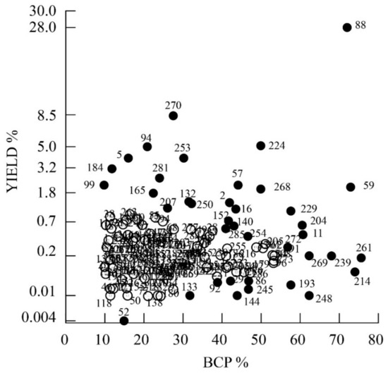 Scatter plot of BCP percentage vs. yield percentage. The yield axis is represented as a power of 0.3 scale in order to evidence species with yields ranging from 0.004 to 3%. Numbers correspond to plant species listed in Table 1. Filled circles outline the species outside the central group of all other species (hollow circles).