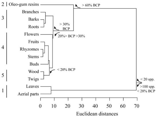 The plant part that contained the highest content of BCP was then analyzed. In order to evidence the statistical linkage between the plant parts, a cluster analysis was calculated by considering as category the plant part and as variables the number of species, the BCP% and the yield% reported in Table 1 (Figure 2). Euclidean distances were calculated by using the average linkage method. Five clusters were evidenced: the first cluster was made by plant parts reported in more than 100 species and was dominated by leaves and aerial parts, which contained in general a BCP percentage lower than 28%. The other four clusters were made by plant parts reported in less than 16 species. These four clusters were further subdivided according to their BCP content (Figure 2). As expected, the highest BCP percentage was found in oleo-gum resins (cluster 2), followed by roots, barks and branches (cluster 3). Flowers and buds (cluster 4) showed a high yield, whereas twigs and woods (cluster 5) had both low yields and BCP percentages (Figure 2).