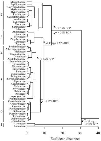 The next analysis was at the familial level. A cluster analysis was calculated with average linkage method by using data of Table 1 by considering as a category the plant families and the species number, yield% and BCP% as variables. The results of the cluster analysis show the presence of 6 clusters (Figure 3). The first cluster is made by the Asteraceae and the Lamiaceae which consist of a number of species > 50 and a BCP% < 31. The second cluster gathers all families whose species have a BCP% > 35%; in this cluster, the Magnoliaceae and the Papilionaceae are separated in a subcluster because of their high BCP% and low yield%, whereas the Fabaceae (which include the above mentioned C. langsdorffii) are separated in a subcluster because of their high yield %. The third cluster is made by families with a number of species > 13 and a BCP% > 23%; here, the Lauraceae, the Apiaceae and the Zingiberaceae are separated in a subcluster because of their higher BCP%. The genus Ocotea is one of the largest of the Lauraceae family, with approximately 350 species distributed throughout tropical and subtropical America. O. splendens, as many other Ocotea species [212] is characterized by a high percentage of BCP [217]. In the Apiaceae family, the species P. kotschyana spreads widely through Anatoly, Iran (northwest, west and center) and north of Iraq and contains BCP in all plant parts [41]. The family Zingiberaceae is well known for producing essential oils that are used to prevent and control several diseases; the species R. breviscapa was found to possess a high percentage of BCP [300]. The fourth cluster is made by families with a BCP% > 26 and a subcluster separates the Atherospermaceae, the Flacourtiaceae and the Meliaceae because of their BCP%. The fifth cluster is made by families with a BCP% < 25 and the Plantaginaceae are separated in a subcluster because of their relatively higher yield%. Finally, the sixth cluster is made by plant families with a low BCP percentage and a subcluster separates the Hernandiaceae, the Juglandaceae, the Phyllanthace and the Ptaeroxylaceae because of their BCP content lower than 11%.