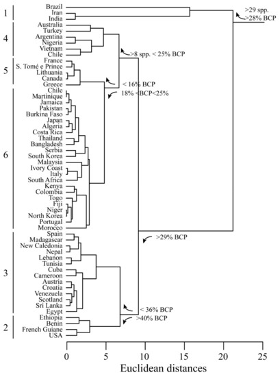 The next analysis aimed to evidence the geographical areas from which the plant species listed in Table 1 were collected. A cluster analysis was calculated with average linkage method, considering the country of origin as a category of their species number, yield% and BCP% as variables. The results of the cluster analysis show the presence of 6 clusters (Figure 4). The first cluster gathers countries with the highest number of species and a BCP percentage higher than 28%; here, a subcluster separates Brazil from India and Iran because of the higher number of species, in agreement with the literature data [310]. The second and third clusters identify countries where BCP has the highest percentages, whereas the fourth cluster gathers countries with a number of species higher than 8. The fifth cluster is made by countries where the BCP content is the lowest, whereas the sixth cluster is made by two subclusters with BCP percentages ranging from 18 to 25%. One of these subclusters is made by countries (Colombia, Fiji, Kenya, Morocco, Niger, North Korea, Portugal and Togo) where the species had a BCP percentage higher than 24% (Figure 4).