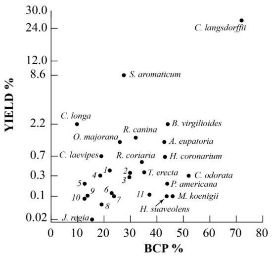 In order to separate which species containing BCP were also represent in the Belfrit list, a scatter plot was obtained by selecting BCP% and yield% as variables (Figure 5). C. langdorffii, S. aromaticum, C. longa and B. virgilioides were characterized by a yield ranging from 2 to 28%, with varying percentages of BCP; on the other hand, high percentages of BCP but lower yields% were found for A. eupatoria, H. coronarium, C. odorata, P. americana and M. keonigi. All other species showed both lower yields and BCP percentage.