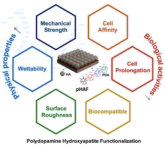 For the last several years, HA and collagen have been broadly used for coating metallic implants to facilitate osseointegration. Most of these methods for coating HA are not cost-effective due to high temperature and energy power requirements, while in the case of collagen coating, the available methods produce unstable coatings. With these obstacles in mind, Tapsir et al. used the PDA film as an intermediate layer to immobilize collagen type I and HA on a medical implant made of stainless steel [72]. These implants were further biomineralized with HA in SBF for an additional seven days. They concluded that immobilizing collagen produced better HA formation and wettability properties that could be favorable for the attachment and proliferation of osteoblast cells on surgical implants. Moreover, the crystallinity and wettability properties were improved with the longest immersion time.
