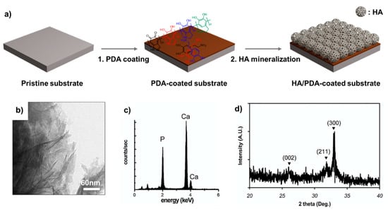 Recently, a generic mechanism for biomimetic mineralization called pHAF was reported by Ryu et al. [2], utilizing PDA coating as a supporting layer for the growth of HA over a substrate material (Figure 3). As a multifunctional biocompatible material, PDA has recently gained considerable attention as a suitable solution to overcome the biomineralization of HA on the surface. Due to its potent bioadhesive capacity, PDA can improve the bioactivities and cellular behaviors of both implant and scaffold biomaterials. This approach involved 2 consecutive functionalization steps. First, a thin film of PDA was coated on the surface of the titanium substrate by submerging it in a DA solution in tris buffer pH 8.5, as previously described [3] Then, the coated material was transferred to a SBF [25,26]. The SBF was prepared with an ion concentration similar to human blood plasma, containing vital ions and anions such as Na+, K+, Ca2+, Mg2+, Cl−, HCO3−, SO42−, HPO42− in tris buffer at pH 7.4. Then, the solution was incubated at 37 °C to promote the biomimetic mineralization of HA. The authors used PDA-coated titanium substrates to systematically study the reaction and HA formation mechanism. Briefly, under the SBF condition, CaP nucleation was occurred, forming the hemispherical CaP agglomerates on the PDA-coated Ti substrate during one day. After the second day, the agglomerates covered most of the substrate surface. The functionalization process was carried out for two weeks. After the functionalization, CaP crystal minerals were generated and fully covered the surface area of the PDA coated material. Noteworthy, the PDA coating layer not only played an anchoring role in binding Ca2+ cations onto the substrate but also cultivated the nucleation of HA biominerals. The morphological change suggests that the formation of CaP biominerals onto the PDA-coated surface is based on the layer-by-layer growing model due to the strong affinity of CaP with the PDA moieties. Several physical characterizations, such as Transmission electron microscopy (TEM), X-ray diffraction (XRD), energy-dispersive X-ray spectroscopy (EDX) were carried out, showing the CaP biomineral was HA biomineral (Figure 3). Interestingly, the pHAF approach can be applied to a variety of materials, including metals, ceramics, semiconductors, and polymers. The HA-PDA composites showed strong adhesion stability under ultrasonication and peeling tests. The cellular response and toxicity test of the HA-PDA layer to preosteoblasts indicated that it was non-toxic to cells. Other reports emphasized that the pHAF coating can modify a non-bioactive surface into a bioactive one [27]. Also, the combination of PDA and HA demonstrates great potential in biomedical applications [28,29].
