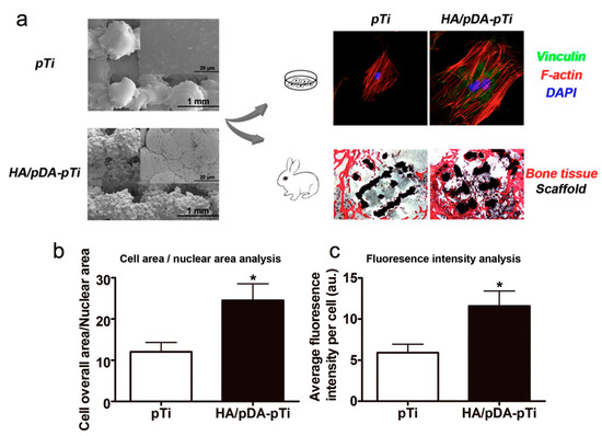 (a) Scanning electron microscopic (SEM) images of bare porous Ti6Al4V scaffolds (pTi) and polydopamine-assisted hydroxyapatite coating on titanium surfaces (HA/pDA-pTi). Fluorescent staining of MC3T3-E1 cells adhered to pTi and HA/pDA-pTi scaffolds, and (b) analysis of morphology of SEM images as shown in panel a and (c) fluorescence intensity of vinculin staining for cells on different scaffolds. Asterisks (*) indicate statistical significance compared to the pTi group, p < 0.05). Reprinted with permission from reference [55]. Copyright (2015) American Chemical Society.