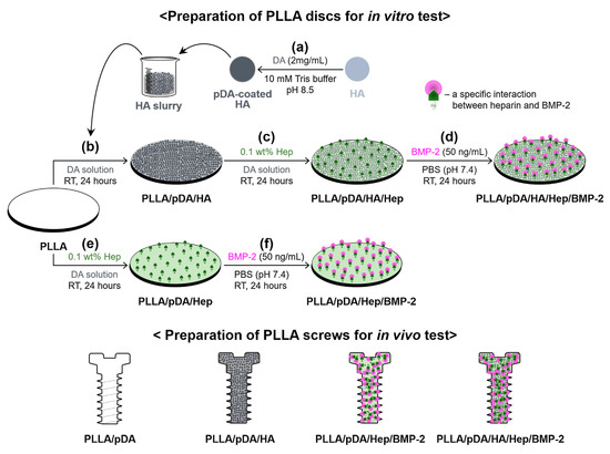 - Yun, Y.J.; Kim, H.J.; Lee, D.W.; Um, S.; Chun, H.J. Polydopamine-mediated surface modifications of poly L-lactic acid with hydroxyapatite, heparin and bone morphogenetic protein-2 and their effects on osseointegration. J. Ind. Eng. Chem. 2018, 67, 244–254. [Google Scholar] [CrossRef]