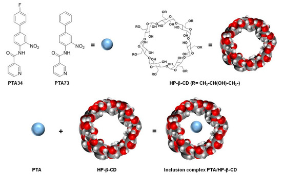 Chemical structures of PTA34, PTA73, hydroxy-propil-β-cyclodextrin (HP-β-CD) and graphical representation of the inclusion complex.