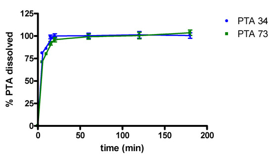 In Figure 4 in vitro dissolution profiles, in 0.05 M phosphate buffer at pH 7.4, of PTA34 and PTA73, from their respective solid-state inclusion complexes, are shown. In the same graph the dissolution profiles of the two uncomplexed compounds are not reported because, due to their very low solubility, the dissolved quantity was well below the detection limit, and this prevented the quantitative determination via UV-VIS spectrophotometry in the dissolution medium. The lipophilic nature of both drugs limits their contact with the dissolution medium, causing them to float on the surface and hindering their dissolution. On the contrary, the freeze-dried complexes dissolve very quickly once they are placed in the dissolution medium and, in both cases, 100% of the complexed drug was solubilized within the first 20 min of the dissolution process.