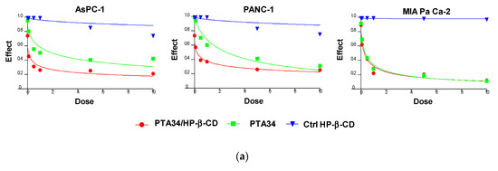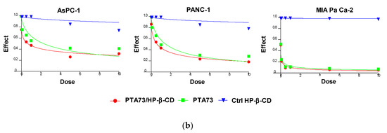 Dose/effect plots of the mean of three different cell proliferation experiments, conducted in PDAC cell lines incubated for 72 h with HP-β-CD (Ctrl HP-β-CD), PTA34, and PTA34/HP-β-CD (panel (a)) or with HP-β-CD (Ctrl HP-β-CD, PTA73, and PTA73/HP-β-CD (Panel (b)). Dose was expressed in each graph as 0.01–10 µM concentration range, in terms of PTA34 or PTA73, corresponding to 2.9–2900 µg/mL concentration range for HP-β-CD alone.