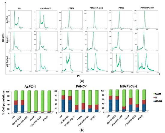 Effects on cell cycle of PDAC cells by CD (Ctrl-CD), complexed PTA34 and PTA73 (PTA34/HP-β-CD and PTA73/HP-β-CD, respectively) and PTA34 and PTA73, alone. The modulation of cell cycle phases was evaluated by flow cytometry (FCM) analysis after staining cells with propidium iodide. In panel (a), a representative analysis of three independent experiments is reported for all cell lines investigated. In panel (b) the bar graph shows cell population percentage in each phase of the cell cycle.
