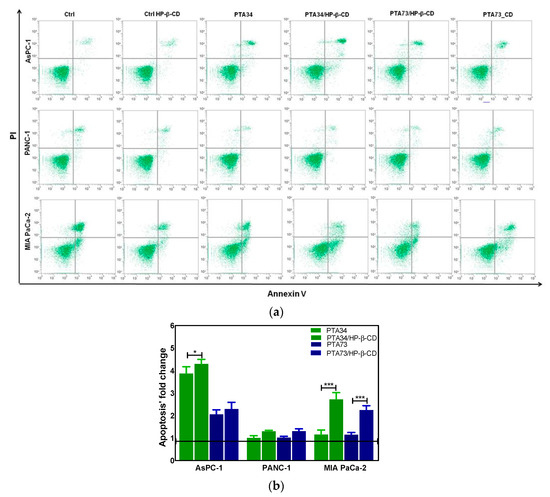 The results of cell cycle analysis prompted us to investigate if the observed phase arrest in G2/M was followed by induction of apoptosis. Thus, the FITC Annexin V staining was carried out after 24 h of incubation of PDAC cells with PTA34 and PTA73 free and complexed in HP-β-CD at the same concentration used for cell cycle analysis (1 µM in terms of PTA’s). Untreated cells and HP-β-CD treated ones, were used as references for PTAs and PTA’s/HP-β-CD complexes, respectively. As representative of apoptosis analysis, the FCM dot plots of Annexin V/PI positive PDAC cells are reported in Figure 7a, whereas fold changes of Annexin V positive cells (early apoptosis plus late apoptosis) in treated samples, versus their specific reference compound, are summarized in Figure 7b. The induction of apoptosis was more evident in AsPC-1 cells when treated with PTA34 complexed and not in respect to PTA73 and PTA73/HP-β-CD, conversely, in MIA PaCa-2 cells both the complexes showed a higher effectiveness than the uncomplexed counterpart. PANC-1 cells showed a completely different behavior, the arrest in G2/M phase after 24 h of treatment did not trigger the marked induction of apoptosis, rather, only a slowdown in cell growth, as observed in cell viability assay. Finally, the HP-β-cyclodextrin alone did not affect the basal condition of cells in terms of apoptotic events (Figure 7a).