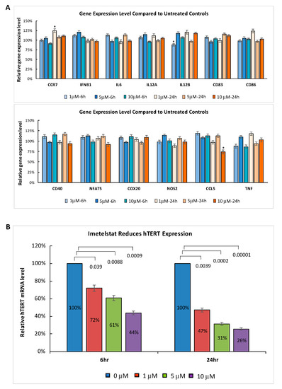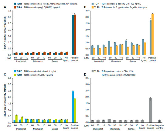 Baerlocher, G.M.; Rusbuldt, J.; Bussolari, J.; Huang, F. Myelosuppression in Patients Treated with the Telomerase Inhibitor Imetelstat Is Not Mediated through Activation of Toll-Like Receptors. Int. J. Mol. Sci. 2020, 21, 6550. https://doi.org/10.3390/ijms21186550