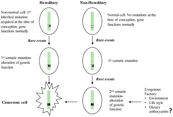 Two-hit theory of the initiation of hereditary and non-hereditary cancer. People with a hereditary susceptibility to GI cancers harbor an inherited genetic mutation on one of the chromosomes at the time of conception and receive the 1st somatic mutation due to the endogenous (e.g., chronic inflammation) or exogenous (e.g., exposure to carcinogens) rare events which in turn inactivate the full function of the respective gene and initiate neoplastic transformation. Non-inherited forms of GI cancer occur by acquiring two somatic mutations in later life, resulting in the inactivation of a gene leading to the initiation of malignancy.