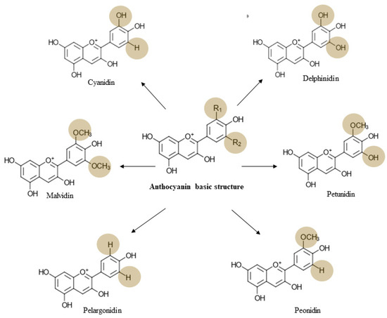 Major anthocyanins derived from the basic anthocyanin structure. Based on the changes in R1 and R2 chemical groups, six major anthocyanins have been identified.