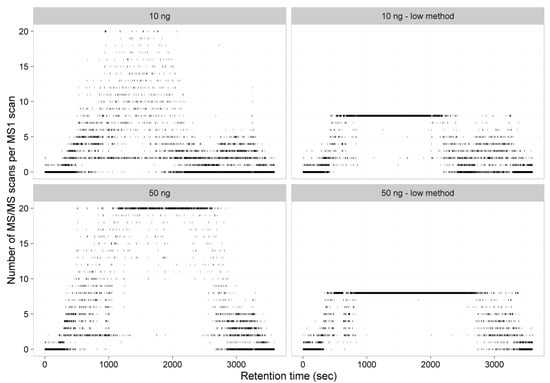 The number of mass spectrometry (MS)/MS scans per MS1 scan in function of the retention time. The samples on the left side are measured using the standard acquisition method. The samples displayed in the righthand panels are measured with the sensitive method, also called the low method.