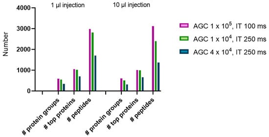 The number of protein groups, top proteins, and peptides based on different injection volumes (1 or 10 µL) and automated gain control (AGC) and injection time (IT) settings.
