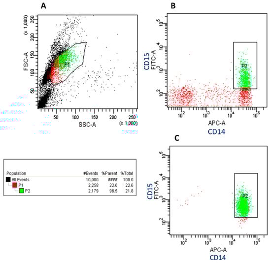 Gating strategy for the analysis of CD14+CD15+ cells from peripheral blood mononuclear cells. (A) Plots are gated on forward scatter (FCS) and side scatter (SSC) to define the leukocytes (P1) from cell debris. (B) Selection of double positive CD14+CD15+ cell population (P2). (C)A post-sort analysis on P2 was performed to determine the purity of the sorted cells. This sorting was confirmed with a purity of 96.5%.