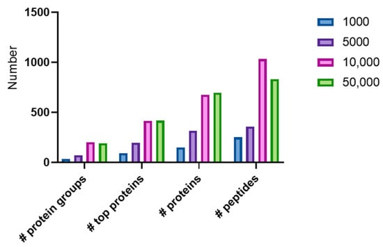 Proteomic analysis was performed with the optimized proteomics workflow for FACS sorted samples containing 1000, 5000, 10,000, and 50,000 cells. An overview of the number of protein and peptide identifications in these samples is represented in Figure 4. In this figure, a distinction is made between proteins (each protein that is identified in the database and has a different accession number is counted), top proteins (where proteins with partial sequences are grouped to a top protein), and protein groups which puts all variants, including proteoforms in a similar group. All protein identifications are based on the presence of at least one unique peptide.