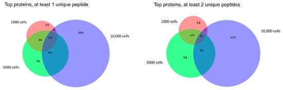 Qualitative proteomic analysis of different amounts of FACS sorted cells. Venn-diagram representing an overlap in the number of top proteins identified between 1000, 5000, and 10,000 cells when either at least one unique peptide per protein is taken into account (left) or when at least two unique peptides per protein are taken into account (right).