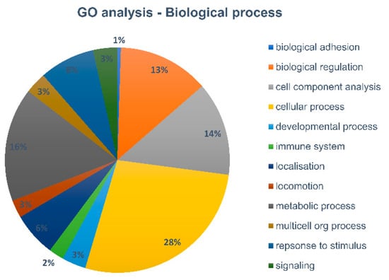 Gene ontology analysis of the 414 top proteins identified in the 10,000 cell sample (based on the one unique peptide per protein rule) and visualized according to the biological process.