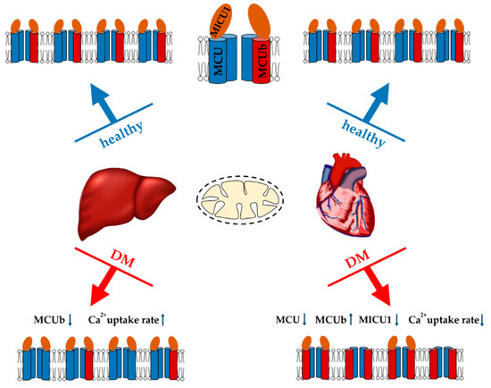 On the other hand, there is evidence that the development of diabetes is accompanied by activation of the calcium uniporter. Indeed, as far back as the 70s, it was shown that the induction of alloxan diabetes stimulates the entry of Ca2+ into liver mitochondria [163]. Recently, we also demonstrated that two weeks after streptozotocin administration to Sprague-Dawley rats, the rate of Ca2+ uptake by liver mitochondria significantly increased. The analysis showed that an increase in the Ca2+ transport rate was due to a decrease in the expression of the dominant-negative MCUb subunit of the uniporter [41]. Adipose tissue mitochondria also show an increase in Ca2+ handling. It was shown that mitochondrial Ca2+ uptake increased and MCU components (MCU and MICU1) were upregulated in insulin-resistant adipocytes. Similar results were observed in mouse (db/db and ob/ob) and human visceral adipose tissue during the progression of obesity and diabetes [164].