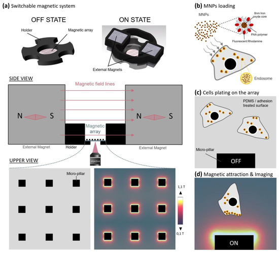 Micro-magnetic arrays, or MMAs, consist of a matrix of soft ferromagnetic elements, or micropillars, that can be magnetized by an external field. The soft ferromagnetic elements are made out of permalloy, which is a nickel-iron alloy known for its interesting magnetic properties. This material gets fully magnetized very fast and has a very low hysteresis curve, meaning that in the absence of an external field the magnetization of the material goes back to zero, allowing for an on/off magnetic switch. The device was made using conventional microfabrication techniques as previously described ([36], Supplementary Materials). The biocompatible layer is processed on top of the magnetic array, such as a layer of PDMS that is spin-coated with a thickness approximately equal to the height of the pillars.