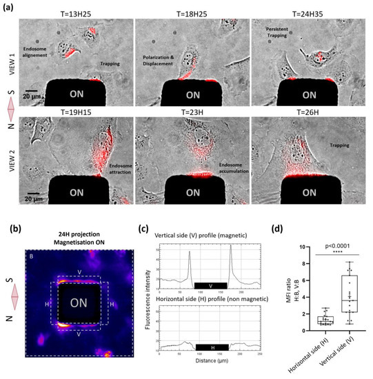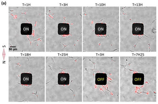 Next, we assessed whether we could remotely control cellular functions such as cell migration using our magnetic tool. The spatial manipulation of cells was previously achieved in non-adherent conditions [39], but the actuation of cell migration in adherent conditions is much more challenging. We performed our first migration assay with HeLa cells, a robust cell that can endure strong magnetic constraints. Cells loaded with particles and plated on the MMA were imaged in transmission and in fluorescence every 5 min for 36 h under magnetic activation. Our results clearly show that pillars can exert substantial forces on the endosomes, attracting them towards the cell membranes and thus triggering migration-like behavior, such as polarization and displacement in the direction of the micro-pillar (Figure 2a). In addition to this directed “migration”, we could also observe prolonged trapping of living cells for several hours at the magnetic pole and transient trapping followed by an escape. Regarding the trapping, the different behavior of cells might be related to the varying MNP loading of the cells, a parameter that unfortunately cannot be controlled. Among all experiments, we observed robust attraction of the cells towards the magnetic poles of the micro-pillar, whereas no significant attraction was observed in the region orthogonal to the direction of the magnetization, where the magnetic field gradient was minimal (thus this direction can be considered as the no-force control). The mean fluorescent intensity (from the MNPs contained within the cells, which could be MNP signals and thus could be regarded as a cell marker) was then averaged over the final 24 h of the magnetic attraction period at the magnetic poles, at the non-magnetic poles of each micro-pillar and on a defined area surrounding the whole pillar with its attraction zone (n = 19 poles; Figure 2b,c). It clearly shows that, during the magnetic attraction, fluorescent endosomes filled with particles accumulate locally at the magnetic poles with an enrichment of four at the magnetic pole (n = 19; Figure 2d), confirming the successful control of cell attraction and retention by the magnetic poles of the micro-pillars. (Supplementary Materials Video S6).
