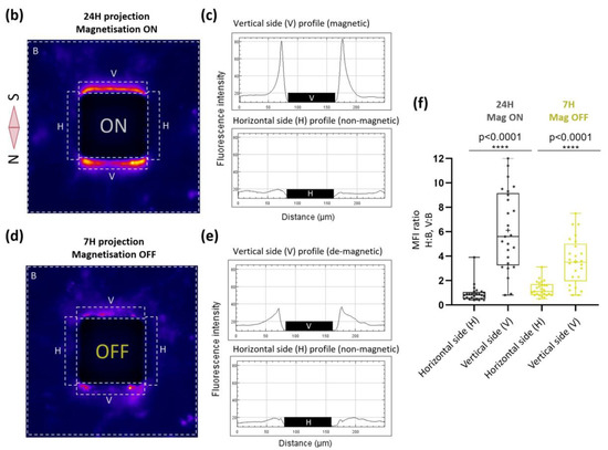 Parallelized magnetic manipulation SHSy-5y cells. (a) Images of one representative field of view at different times during magnetic attraction (24 h), showing collective cellular trapping at the magnetic pole, consequently to the attraction of the magnetic endosomes, depicted in red. After removing the magnetic field (OFF State), captured cells are released and move away from the pillar (last two images). (b,d) Average images (n = 25) of mean fluorescence intensity time projection comprising the different areas measured to estimate the magnetic cellular trapping and relaxation: H (horizontal axis, control), V (vertical axis with and without an external field) and B (background area). (c,e) Curves representing the fluorescent intensity along V and along H. (f) Histogram comparing the cell enrichment between the region close to the magnetic pole (V) and the region orthogonal to the magnetic poles, where no magnetic field gradient is produced ((H region, control)). MFI = mean fluorescence intensity.