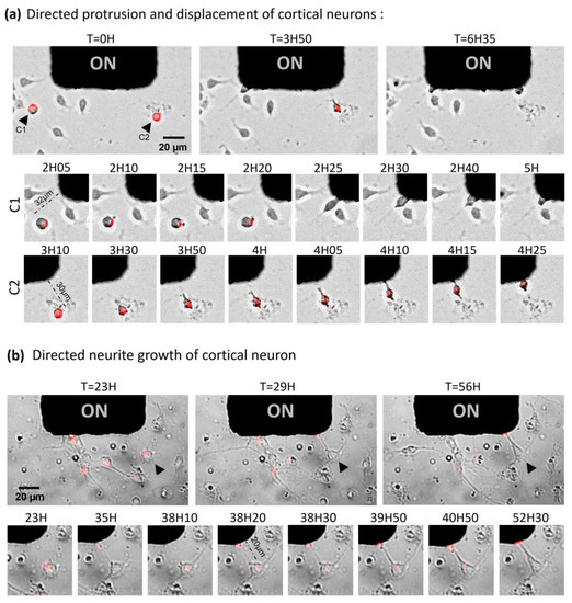 After these promising results on migration, we investigated how the mechano-actuation approach could control the growth of neuronal processes. Given the wide range of forces possibly generated by our system, we assumed that lower force-mediated neurite elongation would be possible to observe. Indeed, as the amplitude of the force depends both on the MNP loading and on the positions of the cells relative to the micro-pillars, statistically we should be able to observe cells that are in the appropriate force range among the cell population plated on the MMA. Fresh cortical neurons were loaded with MNPs and plated on an MMA pre-coated with laminin to stimulate axonal growth. Images of 10 different positions were taken in transmission and fluorescence every 5 min for 24 h (Figure 4a,b; Supplementary Materials Video S8). One single position showed an interesting cellular response, confirming the narrow range of forces that need to be reached to target specific processes. At this distance, we observed two events of directed neurite outgrowth followed by directed cell attraction (Figure 4a). Interestingly, the attraction of these two cells toward the magnetic pillar was preceded by protrusion formation and neurite elongation. These two cells not only migrated in the direction of the micro-pillar, but they also grew neurites in alignment with their movement. Even more interestingly, for one of the two cells, a larger size neurite was formed on the front of the cell, possibly the future axon [41], while a smaller size process was visible on the back. Both directed migration and neurite outgrowth processes may have occurred simultaneously, giving evidence that polarity can be controlled through MNP-induced mechanical forces. However, the forces we apply would have to be modulated properly and the experiments reproduced in order to demonstrate statistically the directed axonal outgrowth without cell body displacement.