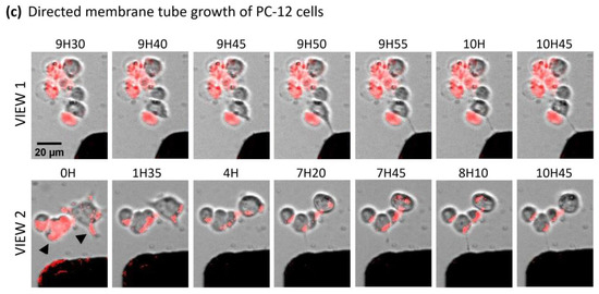 As differentiated PC12 cells displayed natural accumulation of MNP-filled endosomes in the tips of their branches (Figure S2c), this cell line appeared us to be a very good model to demonstrate force-induced neurite elongation. Indeed, the distribution of magnetic endosomes at the neurite tip in the absence of magnetic forces makes possible the pulling and guidance of the extremity of a process, akin to the performance of a growth cone. Unfortunately, multiple magnetic experiments with PC12 cells did not show any directed neurite elongation, nor any cellular attraction from cells exhibiting MNP accumulation in their neurite tip. On the contrary, the differentiated PC12 cells rather retracted their processes, with or without accumulation of MNP at their tip, under the effect of the magnetic field. (Figure 4c, View 2; Supplementary Materials Video S10). However, we could observe on several cells lacking branches the elongation of one single neurite-shaped membrane tube in the direction of the micro-pillars (Figure 4c). These membrane tubes cannot really be identified as formal neurites due to their small cross-sectional diameter, their wave motion and their poor adhesion (Views 1 and 2; Supplementary Materials Video S11). Similar properties have been observed in neurons at the early stage of the growth of magnetically induced neurites, characterized by a rapid rate of elongation. These results suggest that intracellular magnetic endosome distribution, either dispatched between the cell body and branches or concentrated only in the cell body, may be crucial to achieving the threshold of forces needed for initiating membrane protrusive processes. The retraction effect due to the magnetic endosome manipulation has already been reported in a previous study, in which it was shown that neurite outgrowth can be put on hold by applying forces in the low piconewton range produced by magnetic endosomes [48]. Thus, opposite effects, such as elongation or retraction, might be triggered according to the strength of forces applied locally to the plasma membrane, which directly depend on the local density of magnetic endosomes. However, we cannot exclude that the retraction is a cellular stress response due to the magnetic field exposition or experimental conditions. Manipulating endosomes filled with MNPs may therefore be a good method of remote-control initiation and growth of a neurite in a given direction at an early stage of differentiation.