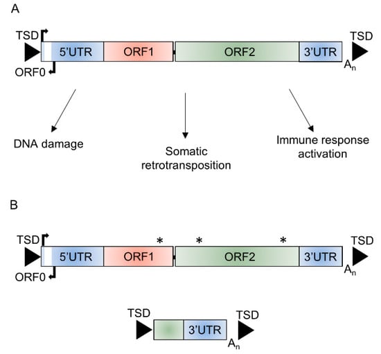 - Faulkner, G.J.; Billon, V. L1 retrotransposition in the soma: A field jumping ahead. Mob. DNA 2018, 9, 22. [Google Scholar] [CrossRef]