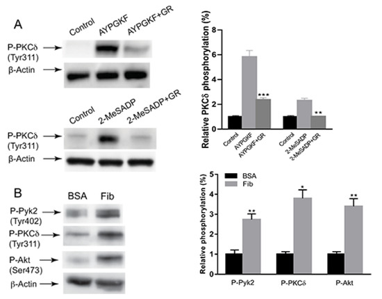 2.3. The Effect of PKCδ on αIIbβ3-Mediated Pyk2 and Akt Phosphorylation