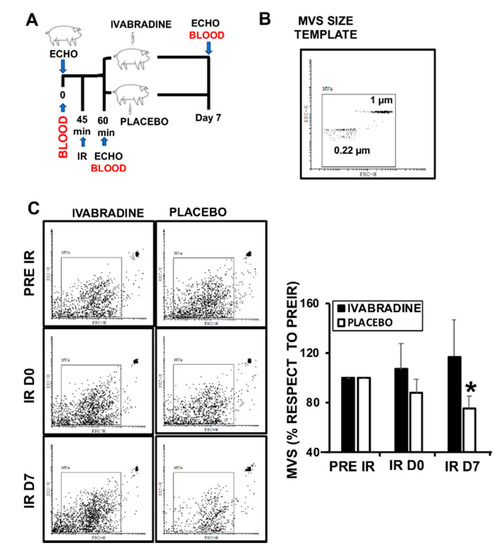 Ivabradine regulates the release of total microvesicles (MVs) after ischemia reperfusion (IR). (A) Schematic representation of the procedure. (B) MVs size template. (C) Flow cytometry detection of plasma MVs at different times after IR (n = 5 pigs/group, mean ± SD; * p < 0.002 IR D7 Ivabradine vs. Placebo).