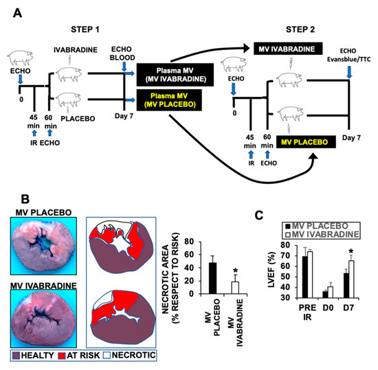 To test whether MVs may have an impact on cardiac function against myocardial infarction, we isolated plasma MVs by day 7 after myocardial infarction from pigs treated with 0.3 mg/kg Ivabradine or Placebo (Figure 2A). Injection of 1 mL/kg (108) MVs into pigs subjected to IR, revealed a significant improvement of cardiac function after 7 days of IR, as detected by a significant increase of left ventricle ejection fraction of hearts from pigs injected with MVs isolated from animals who underwent IR and treated with Ivabradine respect to the Placebo MVs (Figure 2B). The improvement of cardiac function corresponded an important reduction of cardiac necrosis, as shown by Evansblue/TTC staining of cardiac sections isolated 7 days after IR (Figure 2C).