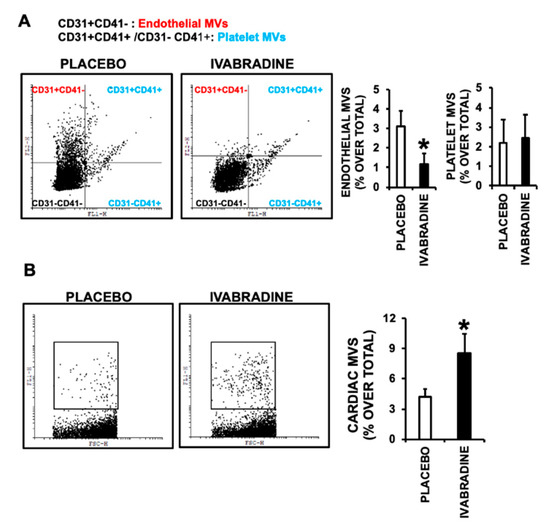 With the aid of specific antibodies, we quantified the release of CD31+ endothelial MVs, CD31+/CD41+ platelet MVs (since CD31 is also expressed in platelets), and HCN4+ derived MVs by flow cytometry. We show that Ivabradine reduced the release of endothelial-CD31+/CD41-derived MVs, while the content of Platelet CD31+/CD41+ MVs remained unchanged (Figure 3A). By contrast, HCN4+ MVs (mostly cardiac-specific) were increased by 50% in the plasma of pigs treated with Ivabradine (Figure 3B).