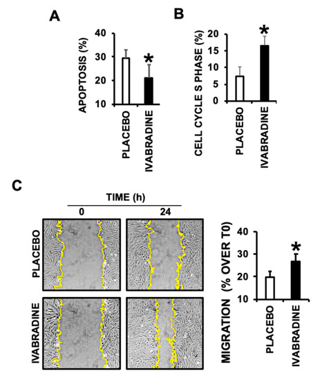 To test the contribution of Ivabradine-induced cardiac MVs, 24-h serum deprived cultured cardiac derived H9c2 cells were incubated for 24 h with 107 Ivabradine or Placebo MVs, finding a significant reduction of apoptosis (Figure 5A), and a cell cycle S-phase increase, indicative of cell proliferation (Figure 5B). Furthermore, a wound healing assay performed in H9c2 cell monolayers, also revealed a positive effect in cell migration, consistently with EMMPRIN-induced MMP activation, in response to Ivabradine derived MVs (Figure 5C).
