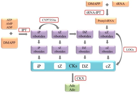 The orange solid box represents the synthetic precursor of cytokinin; the purple solid box represents the intermediate metabolite during the synthesis process; the blue solid box represents cytokinin; the green solid box represents the metabolite of cytokinin. The red boxes indicate some key enzymes in synthesis and metabolism. CKX, cytokinin oxidase/dehydrogenase; cZ, cis-zeatin; DMAPP, dimethylallyl diphosphate; iP, isopentenyl adenine; DZ, dihydrozeatin; tZ, trans-zeatin; IPT, adenosine phosphate-isopentenyl transferase; LOG, LONELY GUY; tRNA-IPT, tRNA-isopentenyltransferase; Ade, adenine; Ado, adenosine.