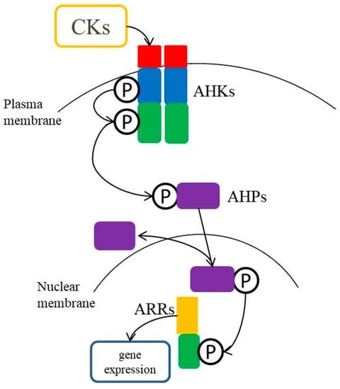 To date, the cytokinin signal transduction pathway has been thoroughly studied. Microorganisms use a two-component system (TCS) to change gene expression levels to respond to various stimuli and improve their ability to perceive and adapt to environmental changes [20,21]. This two-component system includes the following two proteins: histidine kinases (HKs) associated with the membrane and response regulators (RRs) in the cytoplasm. HKs detect the environmental input in the sensor area and transmit the generated signal to the cytoplasm [21]. Based on TCS, plants have evolved a multi-step phosphorylation system, including the following three components: HKs, histidine phosphotransfer proteins (HPs), and RRs (Figure 2) [22]. This multi-step phosphorylation system usually involves continuous phosphorylation events that alternate between histidine (His) and aspartate (Asp) residues [23]. Cytokinin uses this multi-step phosphorylation system for its signal transduction, including participation in cell division, leaf senescence, and apical dominance [24]. In addition, this multi-step phosphorylation system is also an important way for plants to transmit stress signals via cytokinins [25].